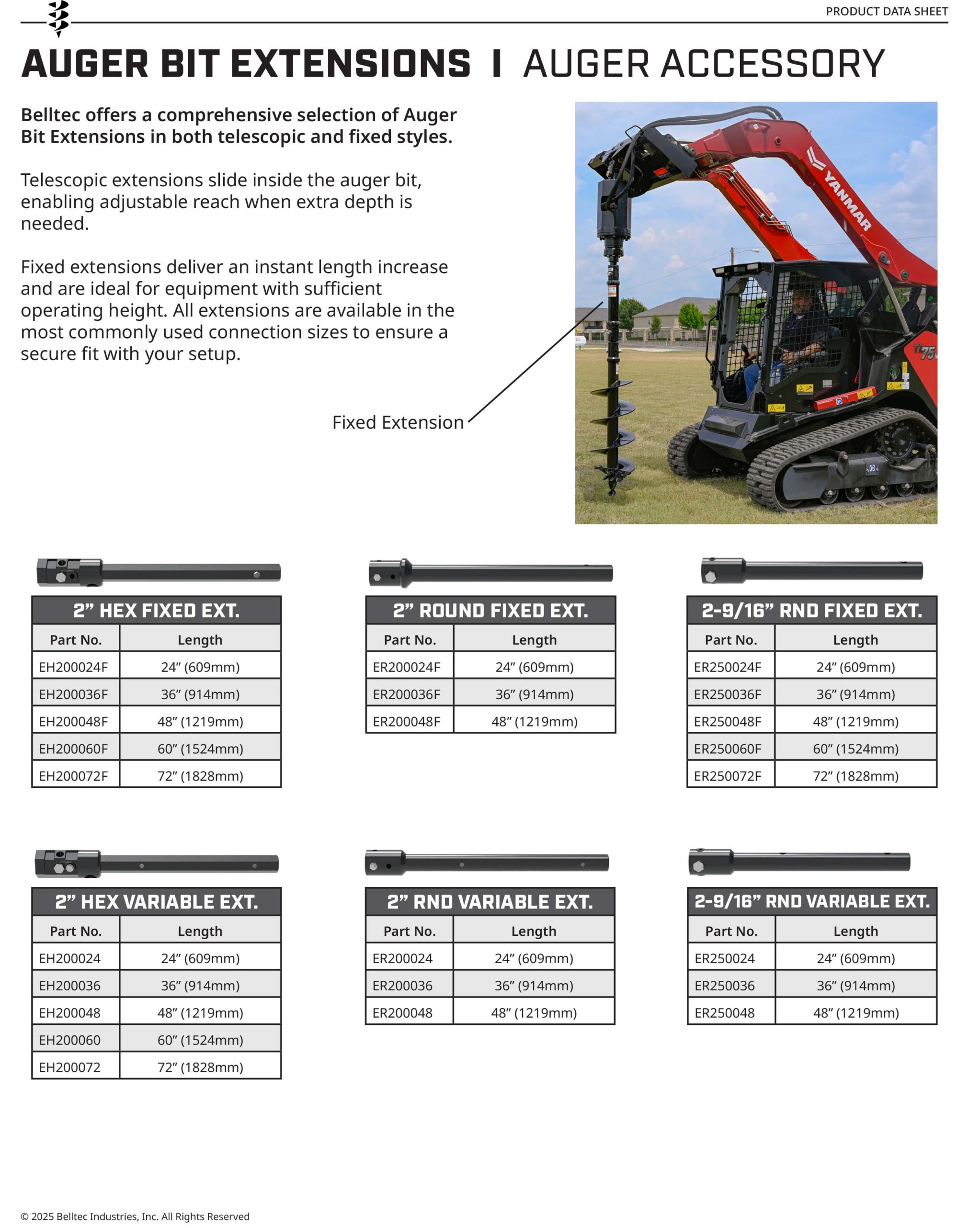 - Interchangeability: HD tubular extensions are compatible with other Belltec and thirdparty auger drives as long as the coupler size matches (e.g., 2″ hex).