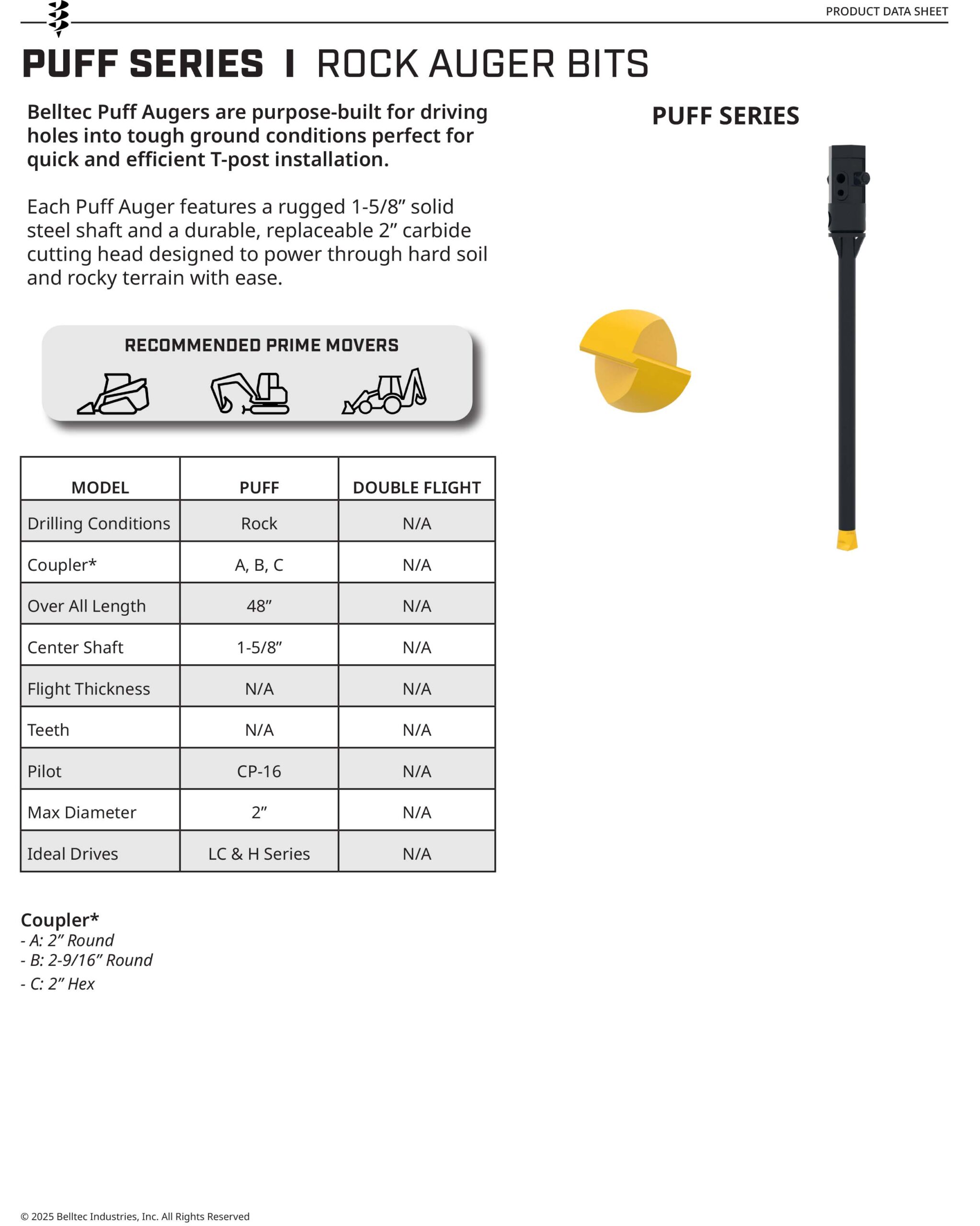 Each Puff Auger features a rugged 1-5/8” solid steel shaft and a durable, replaceable 2” carbide cutting head designed to power through hard soil and rocky terrain with ease.